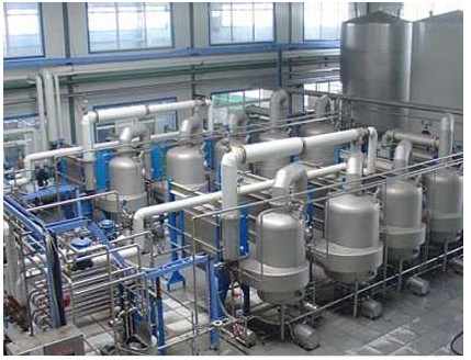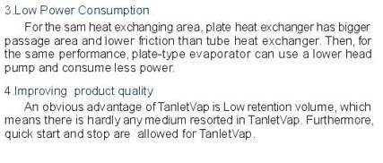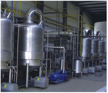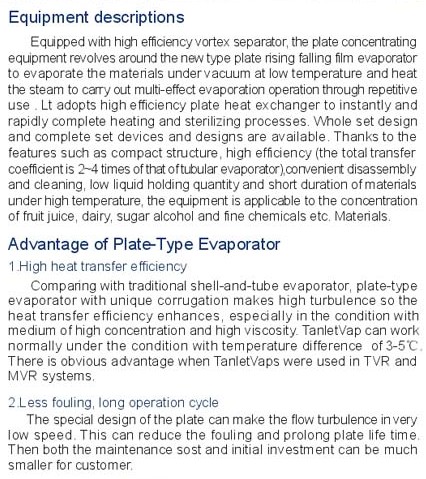 板式濃縮設(shè)備由新型板片式升膜蒸發(fā)器為核心、配以高效旋風(fēng)分離器,物料在真空下低溫蒸發(fā),加熱蒸汽實(shí)行反復(fù)回用的多效蒸發(fā)操作,采用高效板式換熱器的瞬間快速加熱殺菌工藝,可成套設(shè)計(jì)至提供全套裝置及設(shè)計(jì)。本設(shè)備結(jié)構(gòu)緊湊。效率高(總傳系數(shù)為管式蒸發(fā)器的2~4倍)拆卸清洗方便,持液量少,物料在高溫下的時(shí)間短,本設(shè)備可用于中草藥、果汁、乳品、糖醇、精細(xì)化工等物料的濃縮。