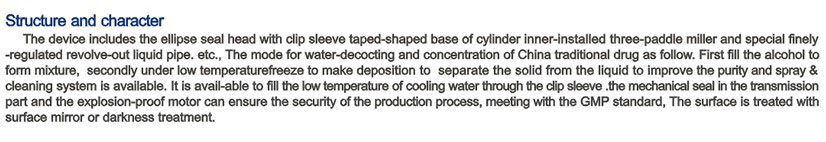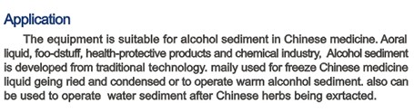 本設(shè)備適用于中藥、口服液、食品、保健品、化工等的酒精沉淀罐系醇沉(亦稱換溶或醇析)舊工藝開發(fā)的專用設(shè)備,主要用于中藥水煎液經(jīng)濃縮后濃縮進行冷凍灌溫酒精沉淀的操作,也可用中藥提后濃縮液進行水沉淀的操作。