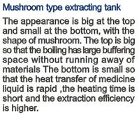 外型上大下小,呈蘑菇狀。上大:沸騰緩沖空間大,不易跑料;下?。核幰菏軣醾鬟f快,加熱時間短,提取效率效高。