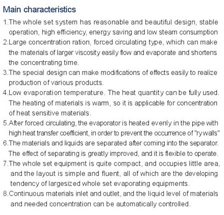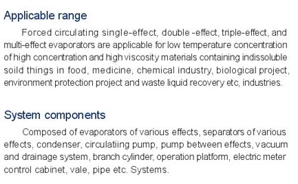 強(qiáng)制循環(huán)式單效、雙效、三效及多效蒸發(fā)器,適用于高濃縮、高粘度,含不溶性固形物等食品、制藥、化工、生物工程、環(huán)保工程、廢液回收等行業(yè)進(jìn)行低溫濃縮。
